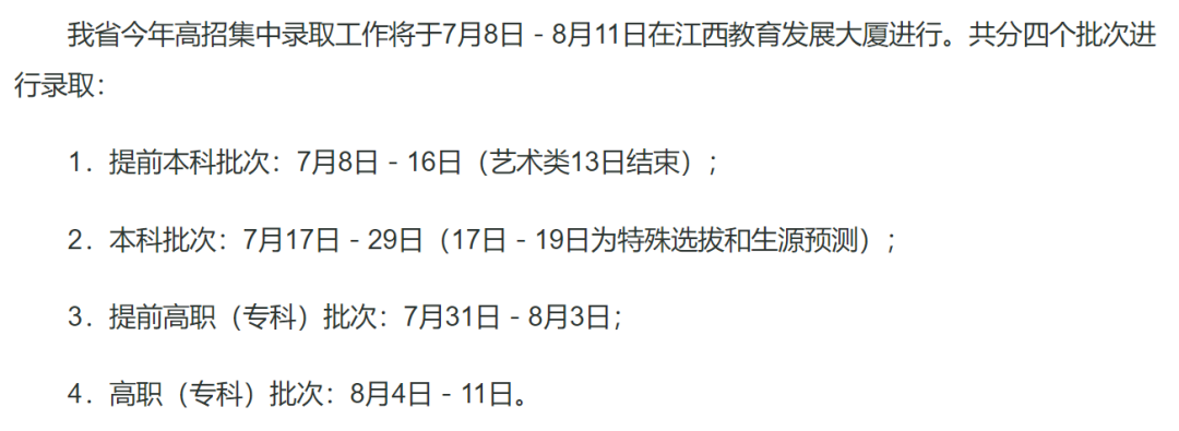 2025年江西高考各批次录取时间安排已发布,内容如下: